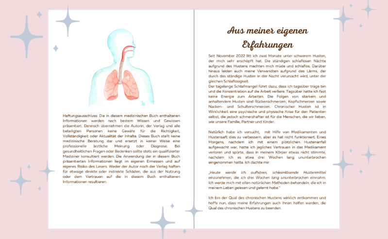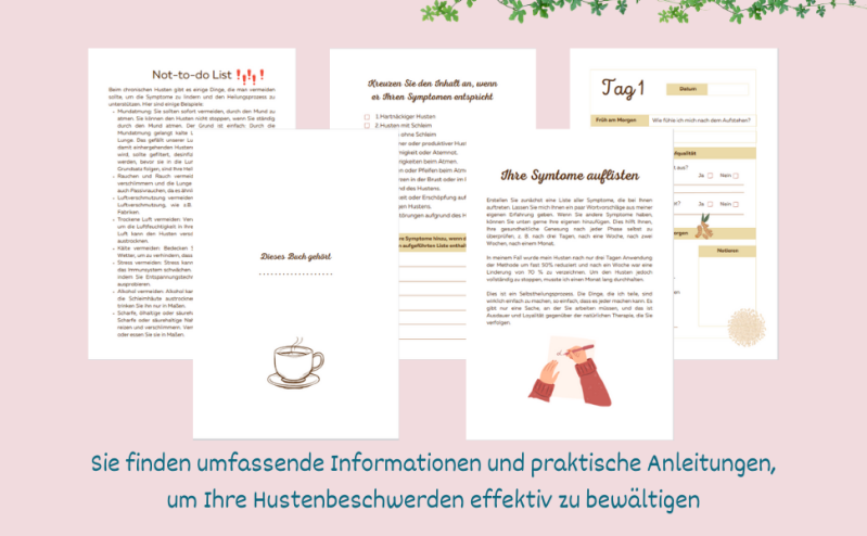 Dieses Hustenfrei und Glücklich Tagebuch basiert auf meiner eigenen Erfahrung und ist darauf ausgerichtet, Ihnen eine natürliche und wirksame Möglichkeit zu bieten, Ihren Husten zu bekämpfen. Ich habe die einzelnen Bestandteile sorgfältig ausgewählt und kombiniert, um Ihnen maximale Linderung zu bieten.